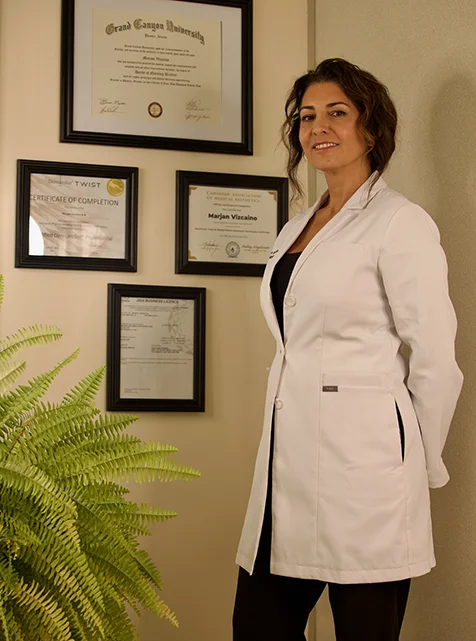 Dr. Marjan Vizcaino DNP, NP MN, is an experienced Board Certified Nurse Practitioner, focusing on functional medicine, hormone therapy and aesthetics, who knows firsthand how life-changing it can be to address hormone imbalances and regain control of your well-being and feel confident in your body again. Marjan is here to listen, guide you through the process, and develop a plan tailored to your unique needs.